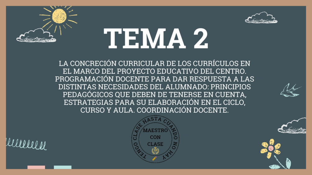 TEMA 2: LA CONCRECIÓN CURRICULAR DE LOS CURRÍCULOS EN EL MARCO DEL PROYECTO EDUCATIVO DEL CENTRO. PROGRAMACIÓN DOCENTE PARA DAR RESPUESTA A LAS DISTINTAS NECESIDADES DEL ALUMNADO: PRINCIPIOS PEDAGÓGICOS QUE DEBEN DE TENERSE EN CUENTA, ESTRATEGIAS PARA SU ELABORACIÓN EN EL CICLO, CURSO Y AULA. COORDINACIÓN DOCENTE.